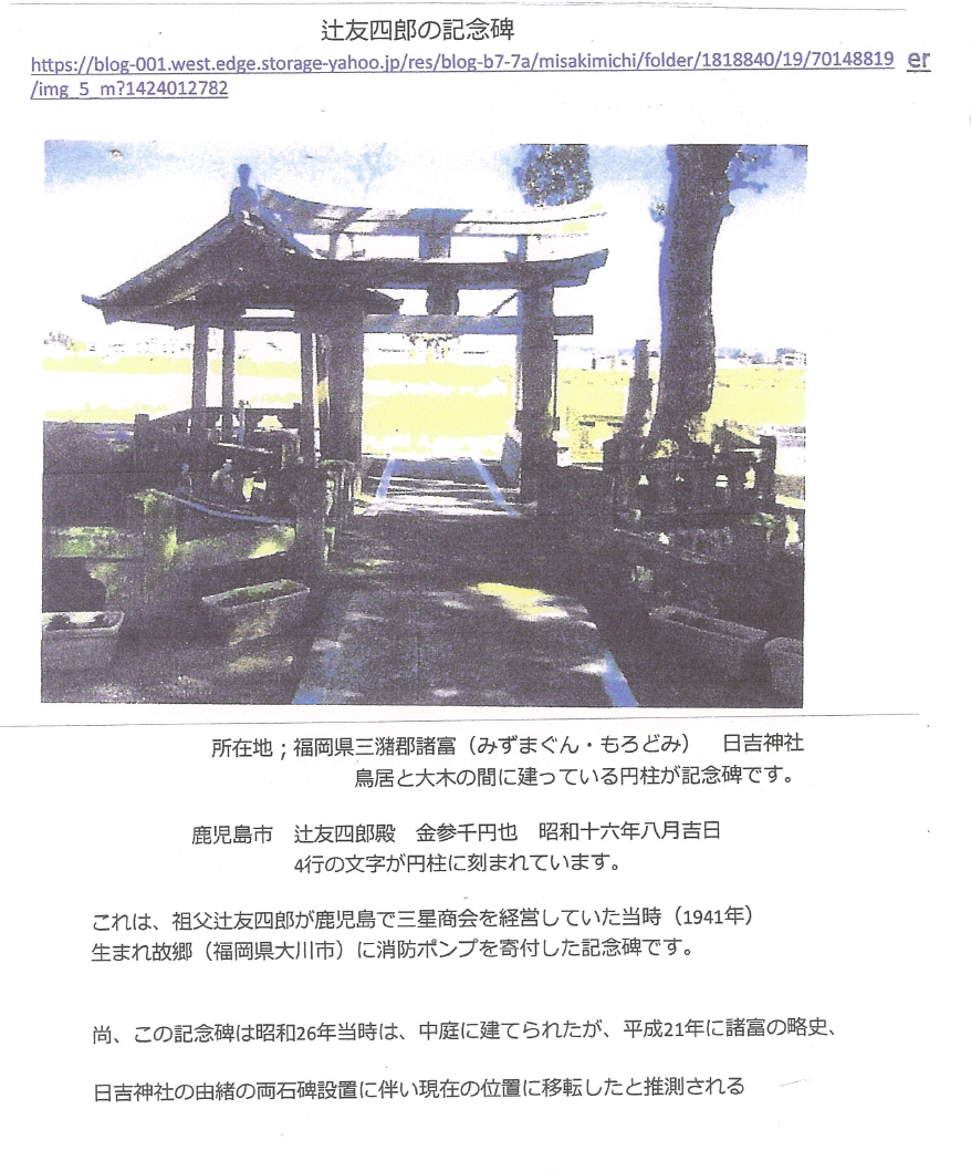 それに先立ち50回忌法事の準備中に、祖父の生まれ故郷の福岡県諸富村の日吉神社に参拝に訪れた際に、神社に祀らている、諸富村と辻家の史跡や、友四郎の記念碑が設立された経緯など、地元で語り継がれている、辻家の伝説や多くの資料をご提供くださいました地元の皆様や縁戚の皆々様方に心から感謝申し上げます。